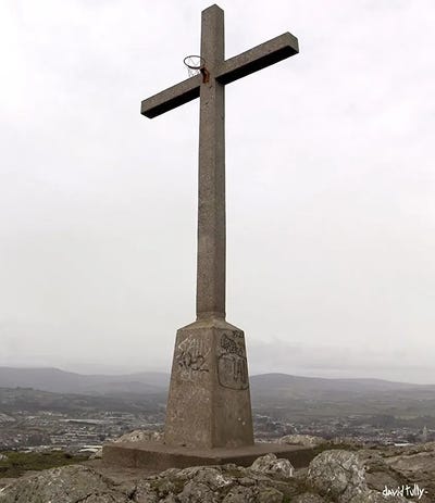 In 2012, Tully climbed to Bray Head, part of the Wicklow Mountains in Ireland, and drilled a basketball hoop into the standing cross. Online, I find two short wordless videos of the hoop’s chain net blowing in the breeze. When Tully pans out, we see rocks and scattered wildflowers in the foreground. The chain net reminds me of our public park court and of Christ’s crown of thorns. The rocks and flowers echo the Garden of Gethsemane, where Jesus mourned his inevitable death, and Golgotha, the place of the skull and the site of his crucifixion. I know all of these stories because I learned them at church, the place we went to with almost as much devotion as we did the basketball court.